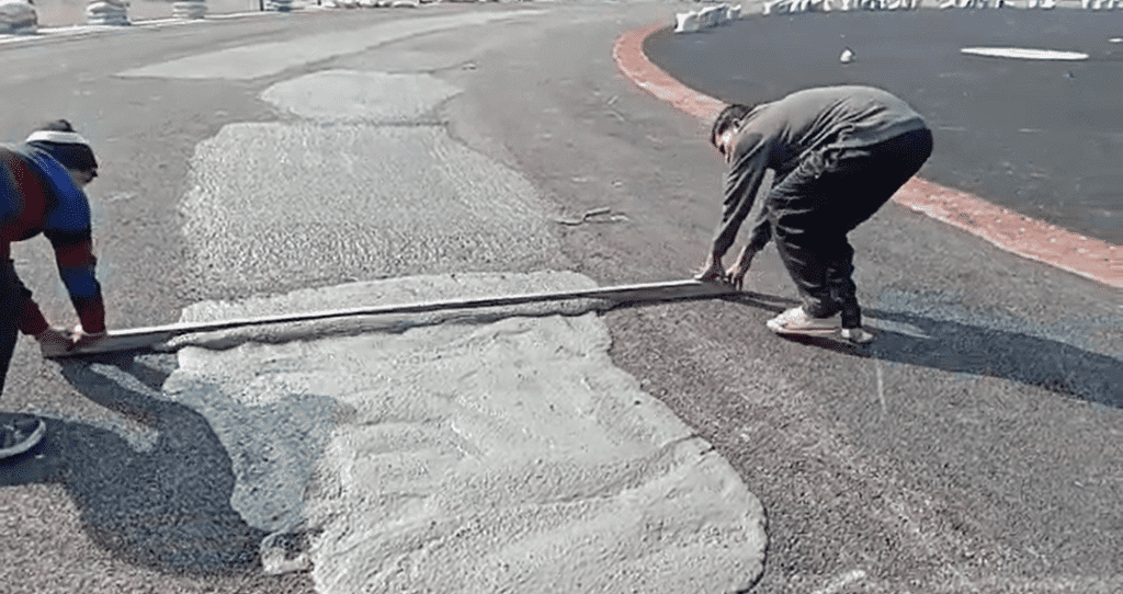 Are you familiar with the word undulation? This article will explain the new deep-patch product from Pacecourt and how it can help fill undulations or balance bases. Let's start by defining what an undulation is. If the basis for acrylic flooring is made incorrectly, it can result in undulation, which is an unbalanced shape on the base brought on by the storage of rainwater in one place. These days, many customers are experiencing undulation, which indicates that this is a prevalent problem. Since Pacecourt is concerned with all of its clients' difficulties, customers no longer need to worry about their base. Pacecourt has developed a new product called the Deep Patch, the best solution for undulation; simply order a Deep Patch and apply it; your undulation will balanced. As seen in this image, they are applying a deep patch solution to ensure the best flooring base.